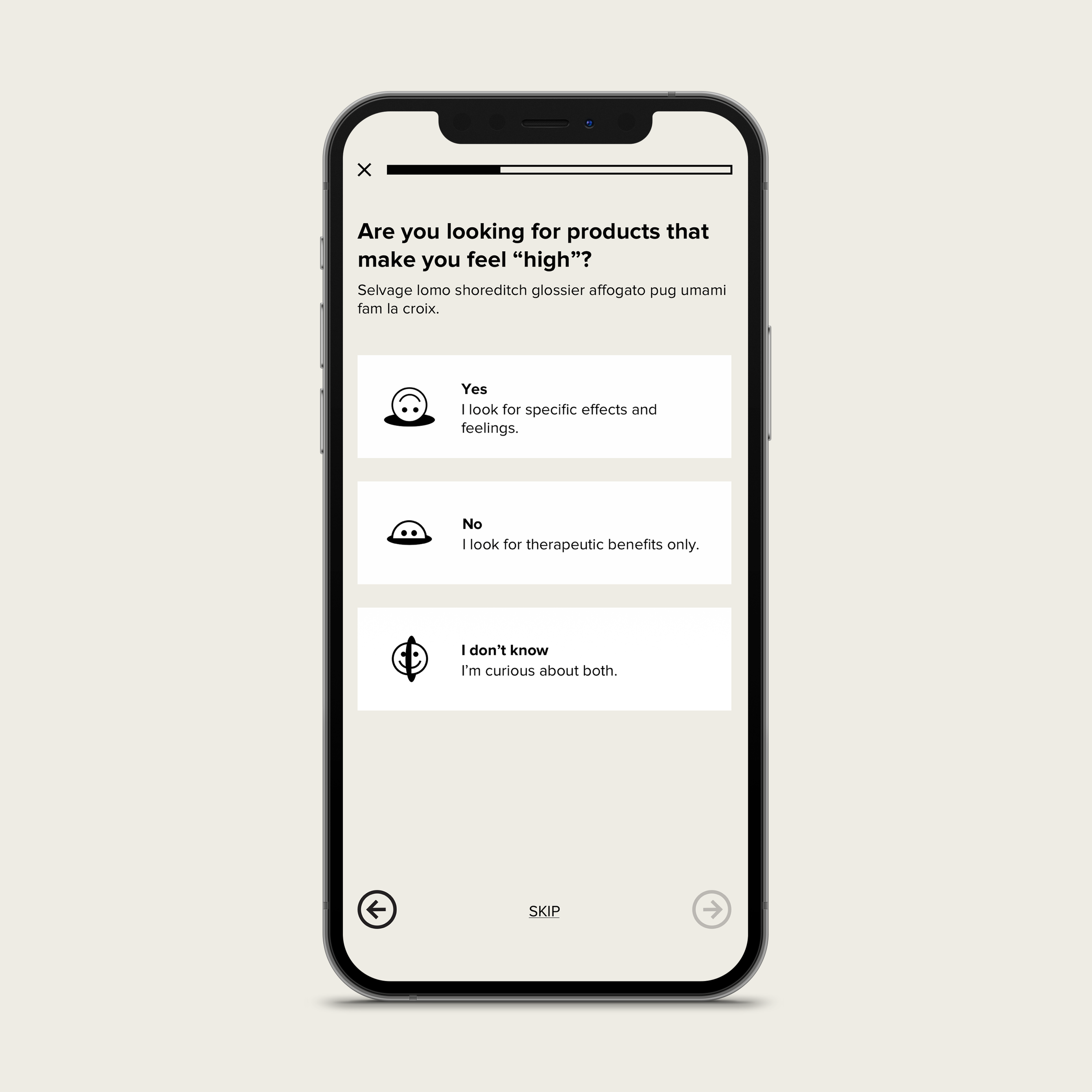Another insight into the cannabis consumer was that many of them don’t know the ins and outs of each product, but they do want to shop by a desired feeling or effect. This question was added to make it as simple as “I want to see products that will make me sleepy.”